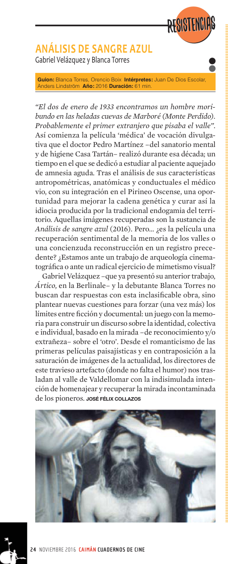 “El dos de enero de 1933 encontramos un hombre moribundo en las heladas cuevas de Marboré (Monte Perdido). Probablemente el primer extranjero que pisaba el valle”. Así comienza la película “médica” de vocación divulgativa que el doctor Pedro Martínez ––del sanatorio mental y de higiene “Casa Tartán”– realizó durante esa década; un tiempo en el que se dedicó a estudiar al paciente aquejado de amnesia aguda. Tras el análisis de sus características antropométricas, anatómicas y conductuales el médico vio, con su integración en el pirineo oscense, una oportunidad para mejorar la cadena genética y curar así la idiocia producida por la tradicional endogamia del territorio. Aquellas imágenes recuperadas son la sustancia de Análisis de sangre azul (2016). Pero… ¿es la película una recuperación sentimental de la memoria de los valles o una concienzuda reconstrucción en un registro precedente? ¿estamos ante un trabajo de arqueología cinematográfica o ante un radical ejercicio de mimetismo visual?.