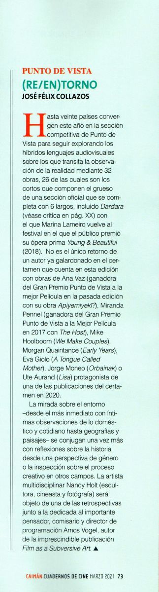 Hasta 20 nacionalidades convergen este año en la sección competitiva de Punto de Vista para seguir explorando los híbridos lenguajes audiovisuales sobre los que transita la observación de la realidad y que este año estará representada en 32 obras entre las que destaca la preeminencia de cortometrajes. Son 26 obras de este formato las que componen el grueso de una sección oficial que se completa con 6 largometrajes, incluido Dardara (ver crítica en este número) con el que Marina Lameiro vuelve al festival en el que el público premió su opera prima Young & Beautiful (2018) para inaugurarlo fuera de concurso. No es el único retorno de un autor ya galardonado en el certamen que cuenta en esta edición con obras de Ana Vaz (ganadora del Gran Premio Punto de Vista a la mejor Película en la pasada edición con su obra Apiyemiyekî?), Miranda Pennel (ganadora del Gran Premio Punto de Vista a la Mejor Película en 2017 con The Host), Mike Hoolboom (We Make Couples), Morgan Quaintance (Early years), Eva Giolo (A Tongue Called Mother), Jorge Moneo (Orbainak) o Ute Aurand (Lisa) protagonista de una de las publicaciones del certamen en 2020.