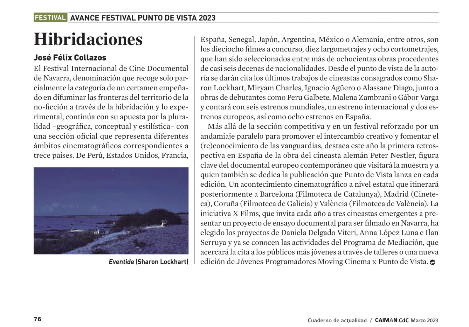 El festival de Cine Internacional de Cine Documental de Navarra, denominación que recoge solo parcialmente la categoría de un certamen empeñado en difuminar las fronteras del territorio de la no-ficción a través de la hibridación y lo experimental, continua con su apuesta por la pluralidad –geográfica, conceptual y estilística– con una sección oficial que representa diferentes ámbitos cinematográficos correspondientes a 13 países. De Perú, Estados Unidos, Francia, España, Senegal, Japón, Argentina, México o Alemania, entre otros, son los 18 filmes a concurso, diez largometrajes y ocho cortometrajes, que han sido seleccionados entre más de 800 obras procedentes de casi seis decenas de nacionalidades. Desde el punto de vista de la autoría se darán cita los últimos trabajos de cineastas consagrados como Sharon Lockhart, Miryam Charles, Ignacio Agüero o Alassane Diago, junto a obras de debutantes como Peru Galbete, Malena Zambrani o Gábor Varga y contará con seis estrenos mundiales, un estreno internacional y dos estrenos europeos, así como ocho estrenos en España.