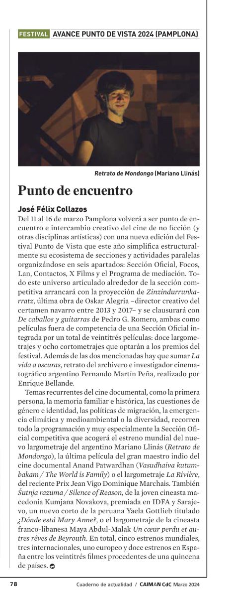Del 11 al 16 de marzo Pamplona volverá a ser punto de encuentro e intercambio creativo del cine de no ficción (y otras disciplinas artísticas) con una nueva edición del Festival Punto de Vista que este año simplifica estructuralmente su ecosistema de secciones y actividades paralelas organizándose en seis apartados: Sección oficial, Focos, Lan, Contactos, X Films y el Programa de mediación. Todo este universo articulado alrededor de la sección competitiva arrancará con la proyección de Zinzindurrunkarratz, última obra de Oskar Alegria –director creativo del certamen navarro entre 2013 y 2017– y se clausurará con De caballos y guitarras de Pedro G. Romero, ambas como películas fuera de competencia de una Sección oficial integrada por un total de veintitrés películas: doce largometrajes y ocho cortometrajes que optarán a los premios del festival además de las dos mencionadas a las que hay que sumar La vida a oscuras, retrato del archivero e investigador cinematográfico argentino Fernando Martín Peña, realizado por Enrique Bellande.