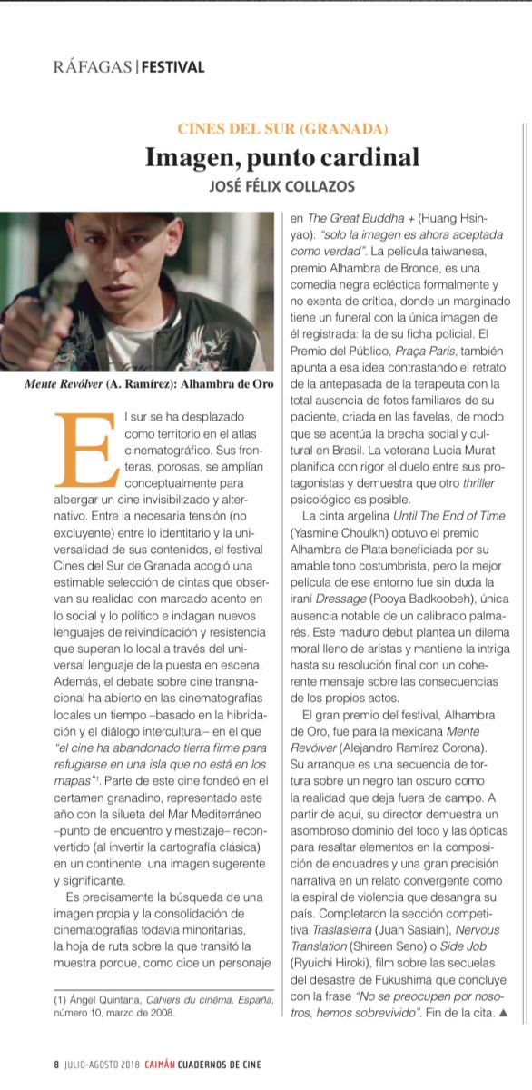 El gran premio del festival, Alhambra de Oro, fue para la mexicana Mente Revolver (Alejandro Ramírez Corona). Su arranque es una secuencia de tortura sobre un negro tan oscuro como la realidad que deja fuera de campo. A partir de aquí, su director demuestra un asombroso dominio del foco y las ópticas para resaltar elementos en la composición de encuadres y una gran precisión narrativa en un relato convergente como la espiral de violencia que desangra su país. Completaron la sección competitiva The Song of Scorpions (Anup Singh), Traslasierra (Juan Sasiaín), Nervous Translation (Shireen Seno) y Side Job (Ryuichi Hiroki), film sobre las secuelas del desastre de Fukushima que concluye con la frase “No se preocupen por nosotros, hemos sobrevivido”. Fin de la cita.