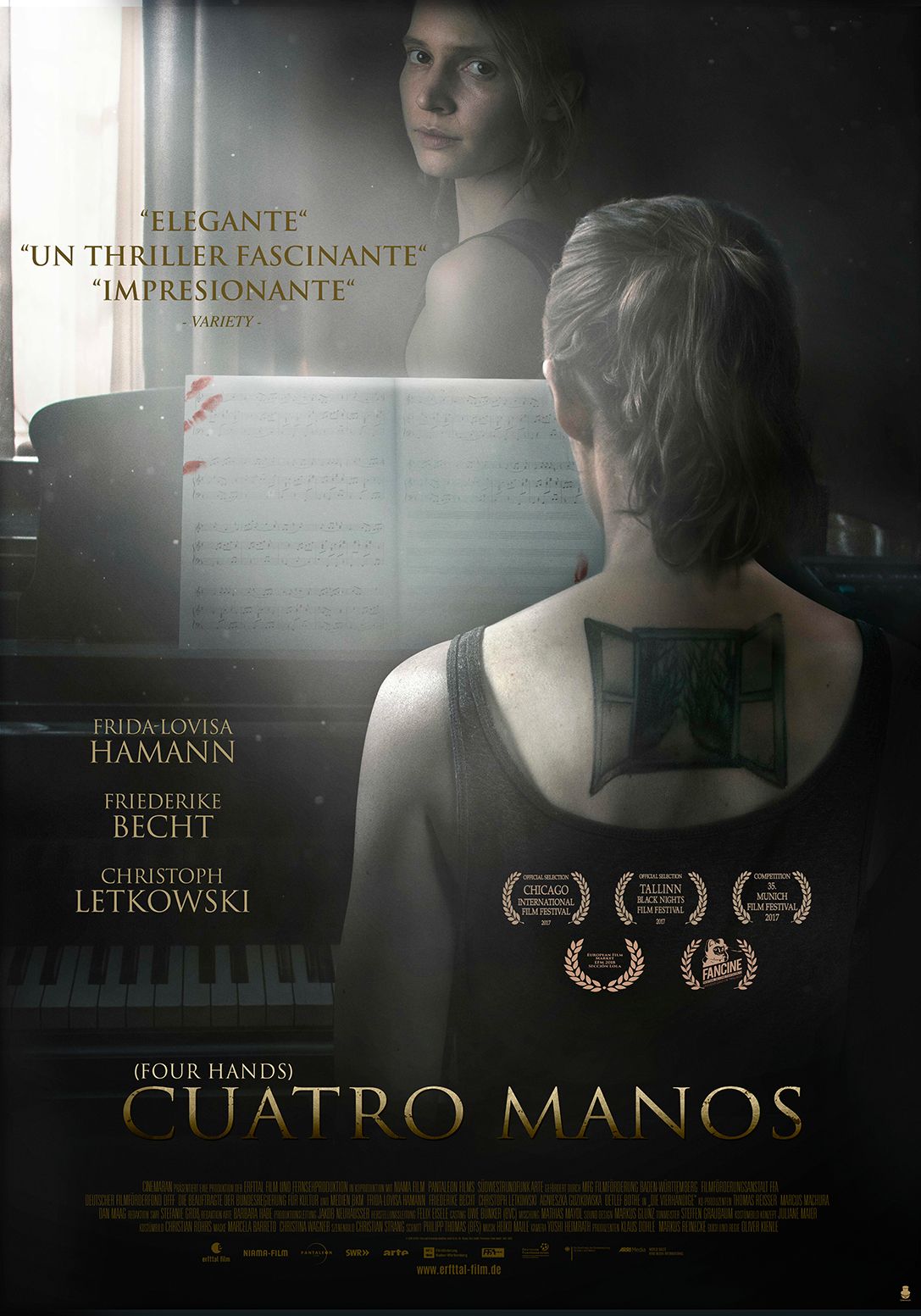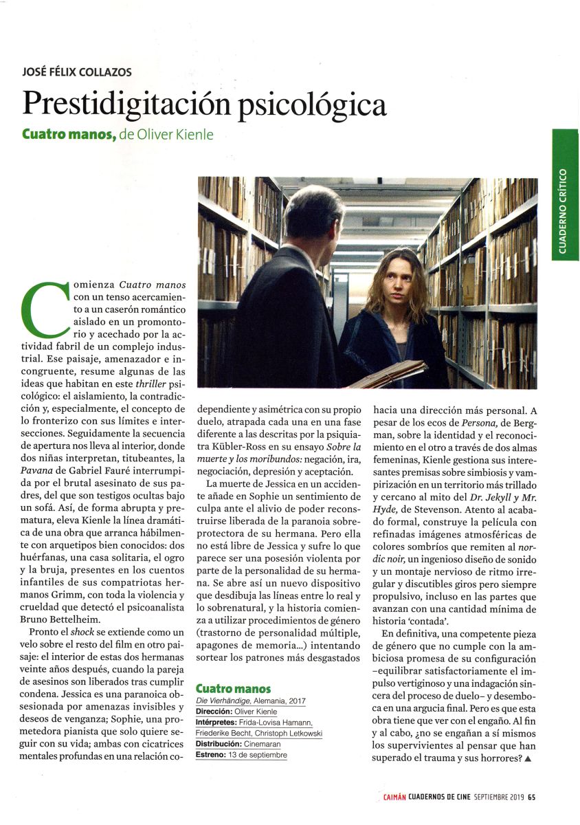 Comienza Cuatro manos con un tenso acercamiento sobre un caserón romántico aislado en un promontorio y acechado por la actividad fabril de un complejo industrial. Ese paisaje, amenazador e incongruente, resume algunas de las ideas que habitan en este thriller psicológico: el aislamiento, la contradicción y, especialmente, el concepto de lo fronterizo con sus límites e intersecciones. Seguidamente la secuencia de apertura nos lleva al interior donde dos niñas interpretan, titubeantes, la Pavana de Gabriel Fauré interrumpida por el brutal asesinato de sus padres del que son testigos ocultas bajo un sofá. Así, de forma abrupta y prematura, eleva Kienle la línea dramática de una obra que arranca hábilmente con arquetipos bien conocidos: dos huérfanas, una casa solitaria, el ogro y la bruja presentes en los cuentos infantiles de sus compatriotas hermanos Grimm con toda la violencia y crueldad que detectó el psicoanalista Bruno Bettelheim.