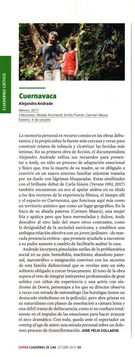 La memoria personal es recurso común en las obras debutantes; y la propia niñez la fuente más cercana y veraz para construir relatos de infancia y cicatrizar las heridas más intimas. En su primera obra de ficción, el documentalista Alejandro Andrade Paese utiliza sus recuerdos para presentar a Andy, un niño en proceso de adaptación emocional y físico que tras la muerte de su madre se ve obligado a convivir en un nuevo entorno familiar mientras transita por un duelo con lágrimas bloqueadas. Estas similitudes con el brillante debut de Carla Simón (Estiu 1993, 2017) también encuentran un eco al apelar ambos en su título a los dos vectores de la experiencia fílmica, el tiempo allí y el espacio en Cuernavaca, que funciona aquí más como un territorio anímico que como un lugar geográfico. En la finca de su abuela paterna (Carmen Maura), una mujer fría y apática pero que hace mermeladas y dulces, Nico descubre al otro lado del muro otros contrastes como la desigualdad de la sociedad mexicana y establece una ambigua relación afectiva con un joven jardinero –de marcada presencia erótica– que promete ayudarle a encontrar a su padre ausente a cambio de facilitarle asaltar la casa.