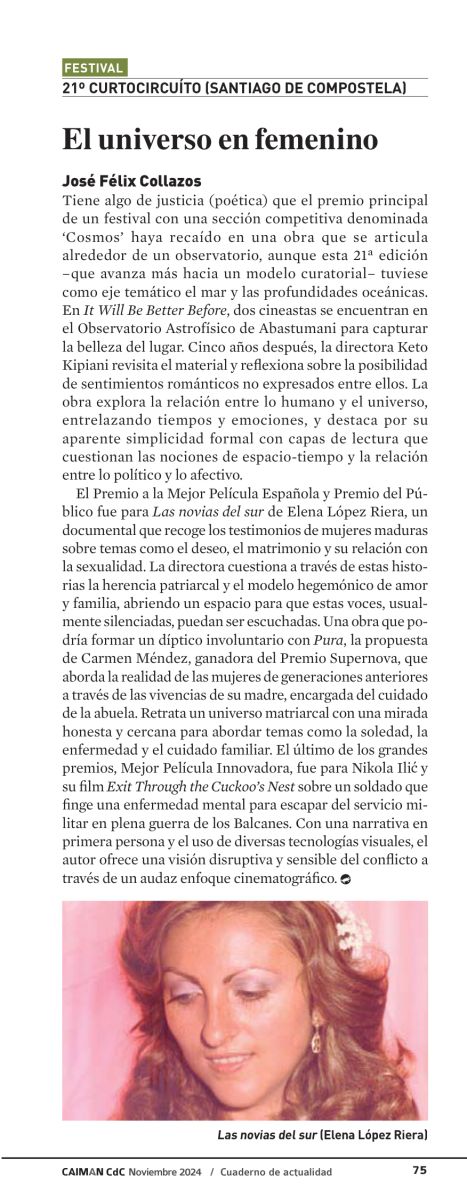 El premio a la Mejor Película Española y Premio del Público fue para Las novias del sur de Elena López Riera, un documental que recoge los testimonios de mujeres maduras sobre temas como el deseo, el matrimonio y su relación con la sexualidad. La directora cuestiona a través de estas historias la herencia patriarcal y el modelo hegemónico de amor y familia, abriendo un espacio para que estas voces, usualmente silenciadas, puedan ser escuchadas. Una obra que podría formar un díptico involuntario con Pura, la propuesta de Carmen Méndez, ganadora del Premio Supernova, que aborda la realidad de las mujeres de generaciones anteriores a través de las vivencias de su madre, encargada del cuidado de la abuela. Retrata un universo matriarcal con una mirada honesta y cercana para abordar temas como la soledad, la enfermedad y el cuidado familiar.