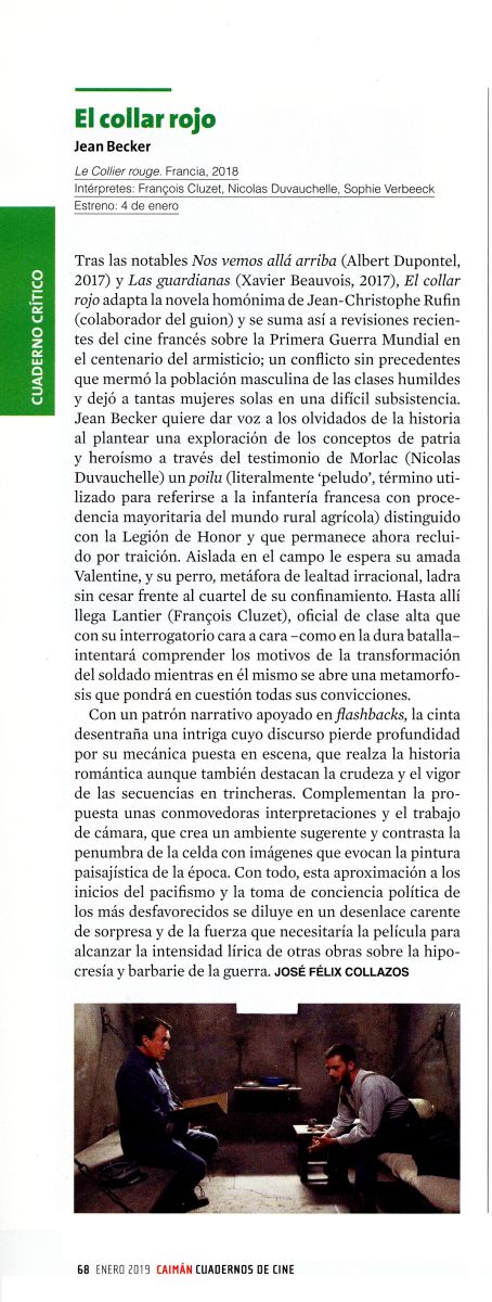 Tras las notables Au revoir là-haut (Albert Dupontel, 2017) y Les Gardiennes (Xavier Beauvois, 2017), El collar rojo adapta la novela homónima de Jean-Christophe Rufin (colaborador del guion) y se suma así a revisiones recientes del cine francés sobre la Primera Guerra Mundial en el centenario del armisticio; un conflicto sin precedentes que mermó la población masculina de las clases humildes y dejó a tantas mujeres solas en una difícil subsistencia. Jean Becker quiere dar voz a los olvidados de la historia al plantear una exploración de los conceptos de patria y heroísmo a través del testimonio de Mauriac (Nicolas Duvauchelle) un “poilu” (literalmente “peludo”, término utilizado para referirse a la infantería francesa con procedencia mayoritaria del mundo rural agrícola) distinguido con la Legión de Honor y que permanece ahora recluido por traición. Aislada en el campo le espera su amada Valentine y su perro, metáfora de lealtad irracional, ladra constantemente frente al cuartel de su confinamiento. Hasta allí llega Lantier (François Cluzet), oficial de clase alta que con su interrogatorio cara a cara –como en la dura batalla– intentará comprender los motivos de la transformación del soldado mientras en él mismo se abre una metamorfosis que pondrá en cuestión todas sus convicciones.