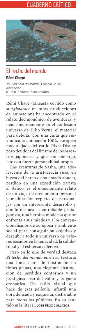 Pero en lo que de verdad destaca El techo del mundo (Tout en haut du monde, 2015) es en su textura: una línea clara de ilustración en tintas planas, una elegante abstracción de perdidos contornos y un prodigioso uso del color y la gama cromática. Un estilo visual que hace de esta película infantil una obra delicada y exquisita, disfrutable para todos los públicos. En su sentido más literal.