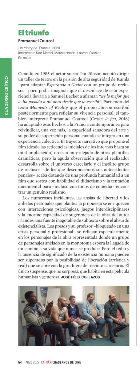 Cuando en 1985 el actor sueco Jan Jönson aceptó dirigir un taller de teatro en la prisión de alta seguridad de Kumla –para adaptar Esperando a Godot con un grupo de reclusos– poco podía imaginar que el desenlace de esta experiencia llevaría a Samuel Becket a afirmar “Es lo mejor que le ha pasado a mi obra desde que la escribí”. Partiendo del texto Moments of Reality que el propio Jönson escribió posteriormente para reflejar su vivencia personal, el también intérprete Emmanuel Courcol (Cessez le feu, 2016) ha adaptado esos hechos a la Francia contemporánea para reivindicar, una vez más, la capacidad sanadora del arte y su poder de superación personal cuando se integra en una experiencia colectiva. El trayecto narrativo que propone el film (desde las reticencias iniciales de los internos hasta su total implicación) no está muy alejado de otras plantillas dramáticas, pero la aguda observación que el realizador desarrolla sobre el universo carcelario y el insólito grupo de reclusos –de los que desconocemos sus antecedentes penales– acaba dotando de una profunda humanidad a un film que sortea con habilidad el didactismo y la tentación documental para –incluso con tonos de comedia– encontrar un genuino realismo.