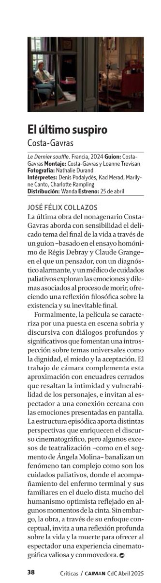 La última obra del nonagenario Costa-Gavras aborda con sensibilidad el delicado tema del final de la vida a través de un guion –basado en el ensayo homónimo de Régis Debray y Claude Grange– en el que un pensador, con un diagnóstico alarmante, y un médico de cuidados paliativos exploran las emociones y dilemas asociados al proceso de morir, ofreciendo una reflexión filosófica sobre la existencia y su inevitable final.