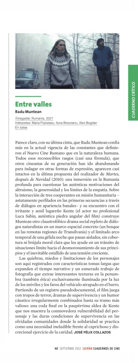 Parece claro, con su última cinta, que Radu Muntean confía más en la actual vigencia de las constantes que definieron el Nuevo Cine Rumano que en la naturaleza humana. Todos esos reconocibles rasgos (casi una fórmula), que otros cineastas de su generación han ido abandonando para indagar otras formas de expresión, aparecen casi intactos en la última propuesta del realizador de Martes después de Navidad (2010): una inmersión en la Rumanía profunda para cuestionar las auténticas motivaciones del altruismo, la generosidad y los límites de la empatía. Sobre la interacción de tres cooperantes en misión humanitaria -astutamente perfilados en las primeras secuencias a través de diálogos en apariencia banales- y su encuentro con el irritante y senil lugareño Kente (el actor no profesional Luca Sabin, auténtica piedra angular del film) construye Muntean otro claustrofóbico drama social repleto de diálogos naturalistas en un marco espacial concreto (un bosque en las remotas regiones de Transilvania) y el limitado arco temporal de una gélida noche que pasan aislados, sin cobertura ni brújula moral clara que les ayude en un tránsito de situaciones límite hacia el desmoronamiento de sus principios y el inevitable estallido de una tensión creciente.