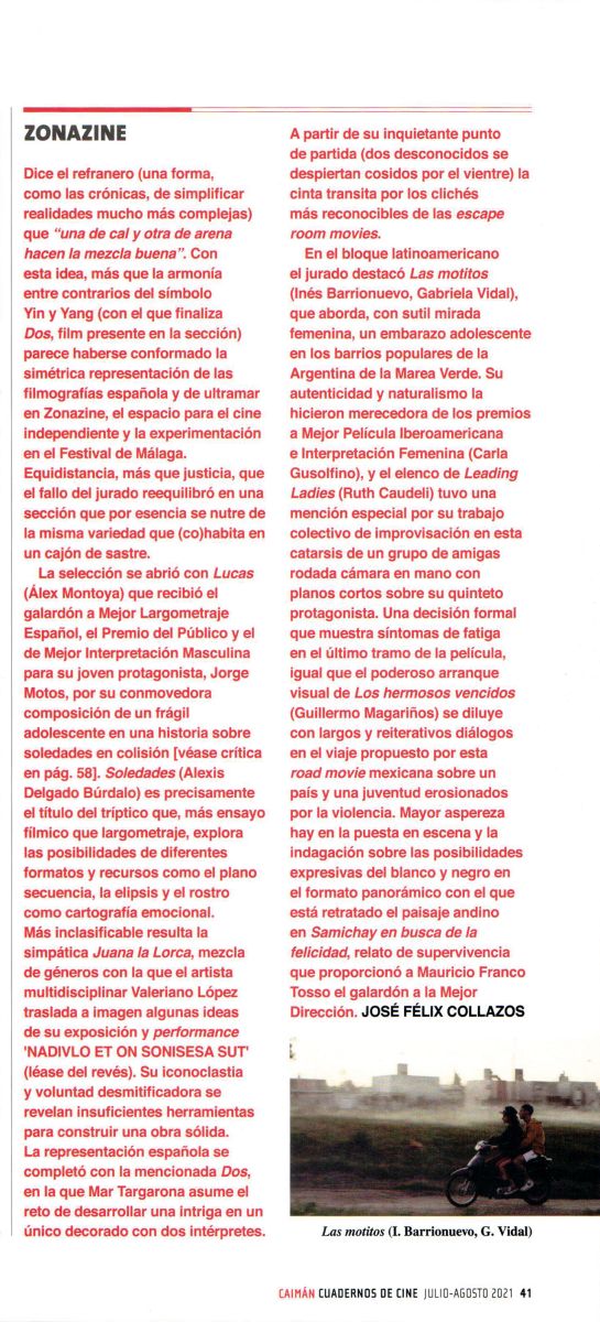En el bloque latinoamericano el jurado destacó Las motitos (Inés Barrionuevo, Gabriela Vidal) que aborda, con sutil mirada femenina, un embarazo adolescente en los barrios populares de la Argentina de la Marea Verde. Su autenticidad y naturalismo la hicieron merecedora de los premios a mejor película e interpretación femenina (Carla Gusolfino), y el elenco de Leading Ladies(Ruth Caudeli) tuvo una mención especial por su trabajo colectivo de improvisación en esta catarsis de un grupo de amigas rodada cámara en mano con planos cortos sobre su quinteto protagonista. Una decisión formal que muestra síntomas de fatiga en el último tramo de la película, igual que el poderoso arranque visual de Los hermosos vencidos (Guillermo Magariños, 2021) se diluye con largos y reiterativos diálogos en el viaje propuesto por esta “road movie” mexicana sobre un país y una juventud erosionados por la violencia. Mayor aspereza hay en la puesta en escena y la indagación sobre las posibilidades expresivas del blanco y negro en el formato panorámico con el que está retratado el paisaje andino en Samichay en busca de la felicidad, relato de supervivencia que proporcionó a Mauricio Franco Tosso el galardón a la mejor dirección.