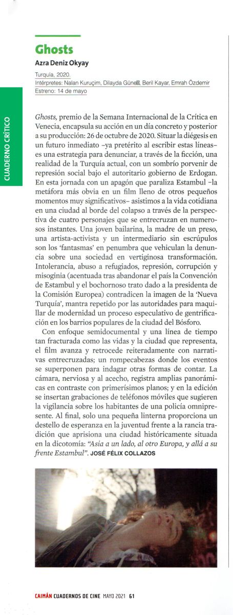Ghosts, premio de la Semana Internacional de la Crítica en Venecia, encapsula su acción en un día concreto y posterior a su producción: 26 de octubre de 2020. Situar la diégesis en un futuro inmediato –ya pretérito al escribir estas líneas– es una estrategia para denunciar, a través de la ficción, una realidad de la Turquía actual, con un sombrío porvenir de represión social bajo el autoritario gobierno de Erdogan. En esta jornada con un apagón que paraliza Estambul –la metáfora más obvia en un film lleno de otros pequeños momentos muy significativos– asistimos a la vida cotidiana en una ciudad al borde del colapso a través de la perspectiva de cuatro personajes que se entrecruzan en numerosos instantes. Una joven bailarina, la madre de un preso, una artista-activista y un intermediario sin escrúpulos son los “fantasmas” en penumbra que vehiculan la denuncia sobre una sociedad en vertiginosa transformación. Intolerancia, abuso a refugiados, represión, corrupción y misoginia (acentuada tras abandonar el país la Convención de Estambul y el bochornoso trato dado a la presidenta de la Comisión Europea) contradicen la imagen de la “Nueva Turquía”, mantra repetido por las autoridades para maquillar de modernidad un proceso especulativo de gentrificación en los barrios populares de la ciudad del Bósforo.