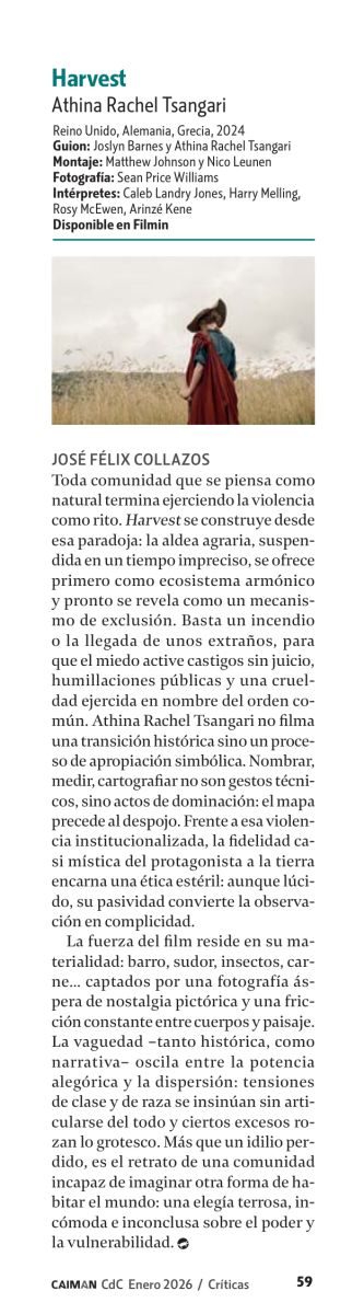 Toda comunidad que se piensa como natural termina ejerciendo la violencia como rito. Harvest se construye desde esa paradoja: la aldea agraria, suspendida en un tiempo impreciso, se ofrece primero como ecosistema armónico y pronto se revela como un mecanismo de exclusión. Basta un incendio o la llegada de unos extraños, para que el miedo active castigos sin juicio, humillaciones públicas y una crueldad ejercida en nombre del orden común. Athina Rachel Tsangari no filma una transición histórica sino un proceso de apropiación simbólica. Nombrar, medir, cartografiar no son gestos técnicos, sino actos de dominación: el mapa precede al despojo. Frente a esa violencia institucionalizada, la fidelidad casi mística del protagonista a la tierra encarna una ética estéril: aunque lúcido, su pasividad convierte la observación en complicidad.