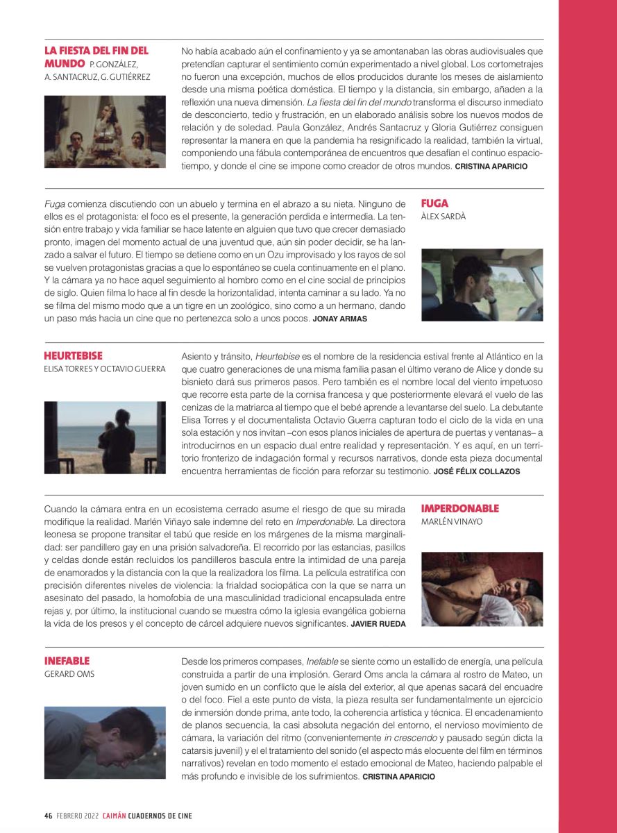 Asiento y tránsito, Heurtebise es el nombre de la residencia estival frente al Atlántico en la que cuatro generaciones de una misma familia pasan el último verano de Alice y donde su biznieto dará sus primeros pasos. Pero también es el nombre local del viento impetuoso que recorre esta parte de la cornisa francesa y posteriormente elevará el vuelo de las cenizas de la matriarca al tiempo que el bebé justo aprende a levantarse del suelo. La debutante Elisa Torres y el documentalista Octavio Guerra capturan todo el ciclo de la vida en una sola estación y nos invitan -con esos planos iniciales de apertura de puertas y ventanas- a introducirnos en un espacio dual entre realidad y representación. Y es aquí, en un territorio fronterizo de indagación formal y recursos narrativos, donde esta pieza documental encuentra herramientas de ficción para reforzar su testimonio.