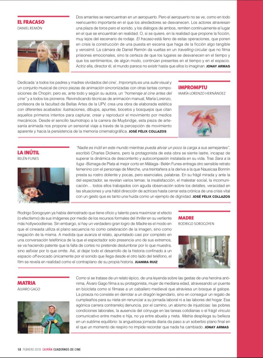 Reivindicando técnicas de animación manual, María Lorenzo, profesora de la facultad de Bellas Artes de UPV, crea una obra de elaborada estética con diferentes acabados: ilustraciones, dibujos, apuntes, bocetos y bosquejos que citan aquellos primeros intentos para capturar, crear y reproducir el movimiento por medios mecánicos. Desde el sencillo taumotropo a la carrera de Muybridge, esta pieza de artesanía animada nos propone un sensorial viaje a través de la percepción de movimiento aparente y hacia la persistencia de la memoria cinematográfica.