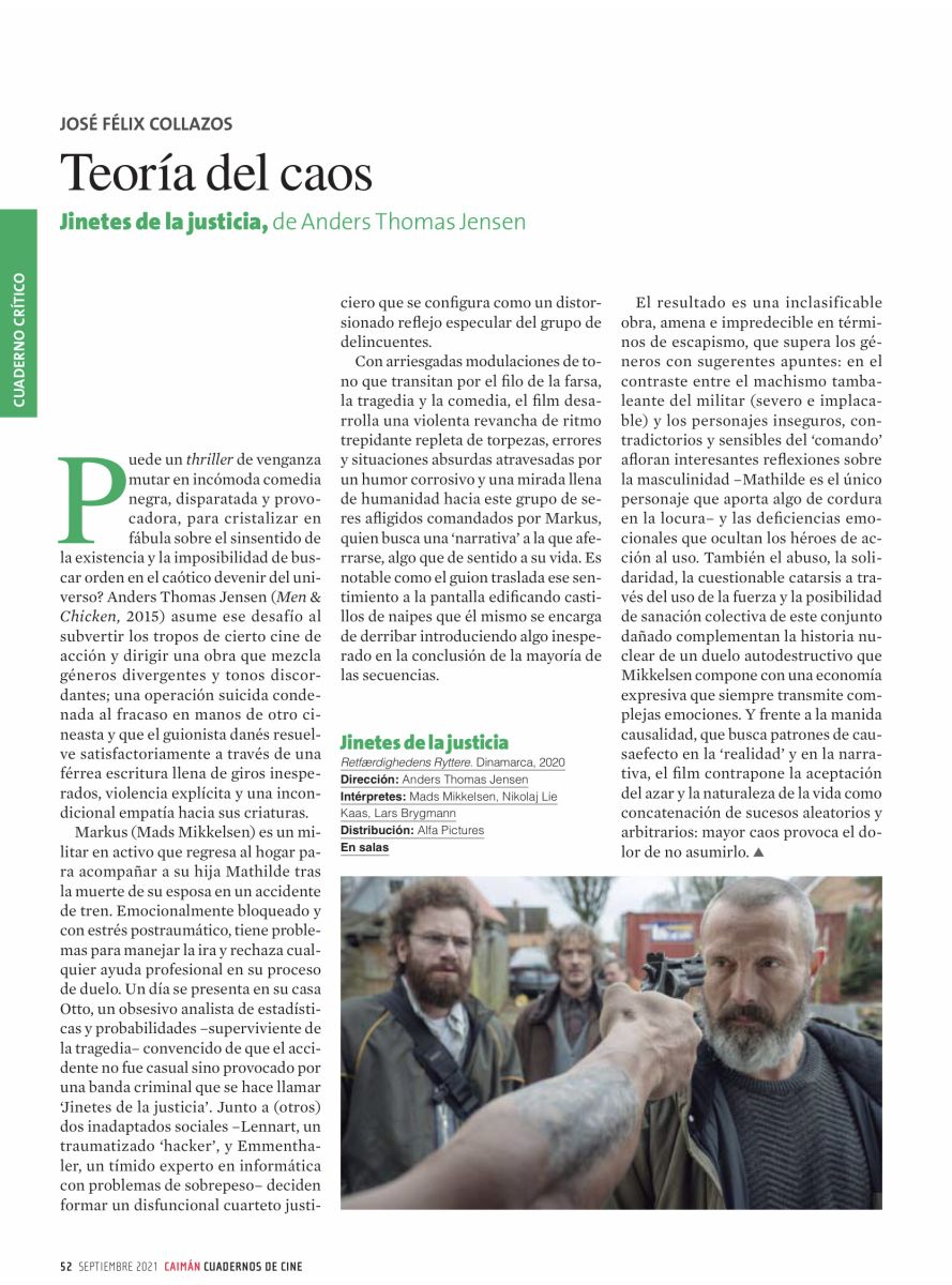 El resultado es una inclasificable obra, amena e impredecible en términos de escapismo, que supera los géneros con sugerentes apuntes: en el contraste entre el machismo tambaleante del militar (severo e implacable) y los personajes inseguros, contradictorios y sensibles del “comando” afloran interesantes reflexiones sobre la masculinidad –Mathilde es el único personaje que aporta algo de cordura en la locura– y las deficiencias emocionales que ocultan los héroes de acción al uso. También el abuso, la solidaridad, la cuestionable catarsis a través del uso de la fuerza y la posibilidad de sanación colectiva de este conjunto dañado complementan la historia nuclear de un duelo autodestructivo que Mikkelsen compone con una economía expresiva que siempre transmite complejas emociones. Y frente a la manida causalidad –que busca patrones de causa-efecto en la “realidad” y en la narrativa– el film contrapone la aceptación del azar y la naturaleza de la vida como concatenación de sucesos aleatorios y arbitrarios: mayor caos provoca el dolor de no asumirlo.