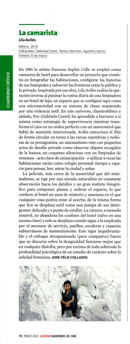 En 1981 la artista francesa Sophie Calle se empleó como camarera de hotel para desarrollar un proyecto que consistía en fotografiar las habitaciones, configurar las historias de sus huéspedes y subvertir las fronteras entre lo público y lo privado. Inspirada por esa obra, Lila Avilés realiza la operación inversa al plasmar la rutina diaria de una limpiadora en un hotel de lujo; un espacio que se configura aquí como una microsociedad con su sistema de clases mantenido por una violencia sutil. En este universo, claustrofóbico y aislado, Eve (Gabriela Cartol) ha aprendido a borrarse a si misma como estrategia de supervivencia mientras transforma el caos en un orden perfecto con un autocontrol que habla de sumisión interiorizada. Avilés estructura el film de forma circular en torno las tareas repetitivas y tediosas de su protagonista, un automatismo roto con pequeños actos de desafío privado como observar objetos recogidos de la basura, un coqueteo silencioso con un limpiador de ventanas –acto clave de emancipación– o utilizar a veces las habitaciones vacías como refugio personal: tiempo y espacio para pensar, leer, mirar la ciudad y soñar.