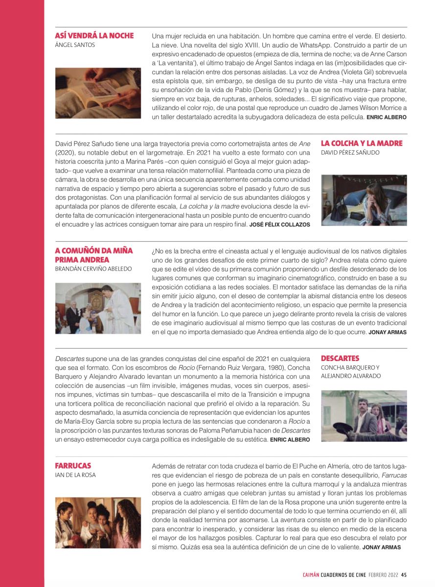 David Pérez Sañudo tiene una larga trayectoria previa como cortometrajista antes de Ane (2020), su notable debut en el largometraje. En 2021 ha vuelto a este formato con una historia coescrita junto a Marina Parés –la guionista con la que consiguió el Goya al mejor guion adaptado– que vuelve a examinar una tensa relación maternofilial. Planteada como una pieza de cámara, la obra se desarrolla en una única secuencia aparentemente cerrada como unidad narrativa de espacio y tiempo pero abierta a sugerencias sobre el pasado y futuro de sus dos protagonistas. Con una planificación formal al servicio de sus abundantes diálogos y apuntalada por planos de diferente escala, La colcha y la madre evoluciona desde la evidente falta de comunicación intergeneracional hasta un posible punto de encuentro cuando el encuadre y las actrices encuentran aire para un respiro final.