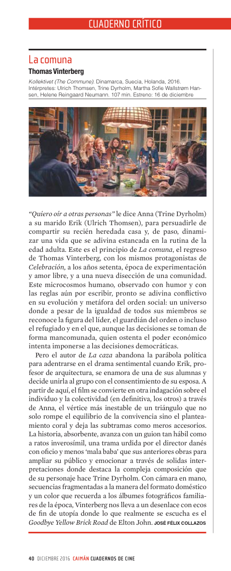 La historia, absorbente, avanza con un guion tan hábil como a ratos inverosímil, una trama urdida por el director danés con oficio y menos “mala baba” que sus anteriores obras para ampliar su público y emocionar a través de solidas interpretaciones donde destaca la compleja composición que de su personaje hace Trine Dyrholm. Con cámara en mano, secuencias fragmentadas a la manera del formato doméstico y un color que recuerda a los álbumes fotográficos familiares de la época, Vinterberg nos lleva a un desenlace con ecos de fin de utopía donde lo que lo que realmente se escucha es “Goodbye Yellow Brick Road”.