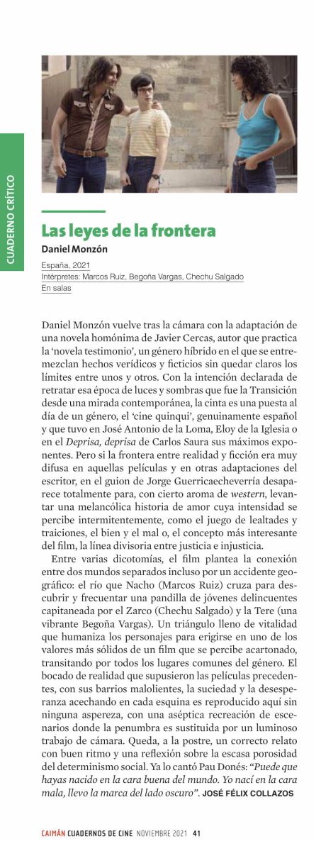 Daniel Monzón vuelve tras la cámara con la adaptación de una novela homónima de Javier Cercas, autor que practica la “novela testimonio”, un género híbrido en el que se entremezclan hechos verídicos y ficticios sin quedar claros los límites entre unos y otros. Con la intención declarada de retratar esa época de luces y sombras que fue la Transición desde una mirada contemporánea, la cinta es una puesta al día de un género –el “cine quinqui”– genuinamente español y que tuvo en José Antonio de la Loma, Eloy de la Iglesia o en el Deprisa, deprisa de Carlos Saura sus máximos exponentes. Pero si la frontera entre realidad y ficción era muy difusa en aquellas películas y en otras adaptaciones del escritor, en el guion de Jorge Guerricaecheverría desaparece totalmente para, con cierto aroma de “western”, levantar una melancólica historia de amor cuya intensidad se percibe intermitentemente, como el juego de lealtades y traiciones, el bien y el mal o, el concepto más interesante del film, la línea divisoria entre justicia e injusticia.