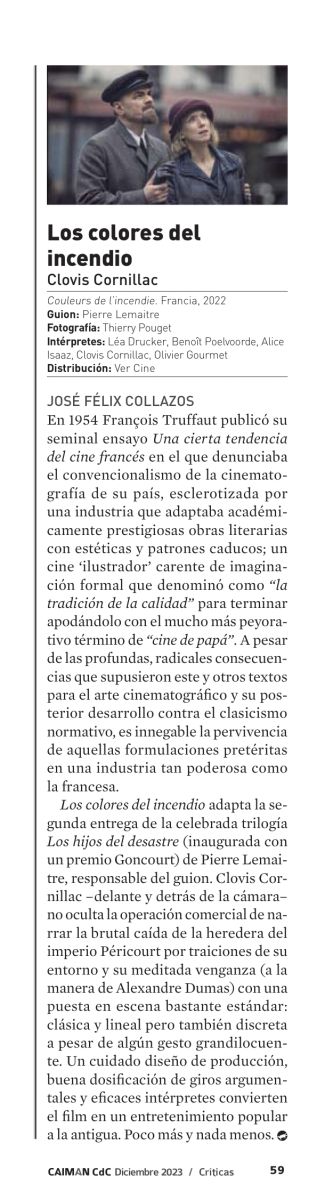Los colores del incendio adapta la segunda entrega de la celebrada trilogía Los hijos del desastre (inaugurada con un premio Goncourt) de Pierre Lemaître, responsable del guion. Clovis Cornillac –delante y detrás de la cámara– no oculta la operación comercial de narrar la brutal caída de la heredera del imperio Péricourt por traiciones de su entorno y su meditada venganza (a la manera de Alexandre Dumas) con una puesta en escena bastante estándar: clásica y lineal pero también discreta a pesar de algún gesto grandilocuente. Un cuidado diseño de producción, buena dosificación de giros argumentales y eficaces intérpretes convierten el film en un entretenimiento popular a la antigua. Poco más y nada menos.