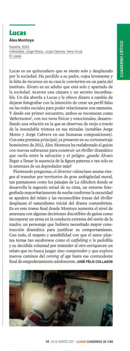 Lucas es un quinceañero que se siente solo y desplazado por la sociedad. Ha perdido a su padre, cojea levemente y la falta de recursos en su casa le convierten en un paria del instituto. Álvaro es un adulto que está solo y apartado de la sociedad. Acarrea una cámara y un secreto inconfesable. Un día aborda a Lucas y le ofrece dinero a cambio de dejarse fotografiar con la intención de crear un perfil falso en las redes sociales para poder relacionarse con menores. Y desde ese primer encuentro, ambos se reconocen como “defectuosos”, con sus taras físicas y emocionales, desarrollando una relación en la que se observan de reojo a través de la insondable tristeza en sus miradas (notables Jorge Motos y Jorge Cabrera en sus humanas composiciones). Con esta premisa principal, ya presente en su cortometraje homónimo de 2012, Alex Montoya ha reelaborado el guion con nuevas subtramas para construir un thriller dramático que oscila entre la salvación y el peligro: ¿puede Álvaro llegar a llenar la ausencia de la figura paterna o tan solo es la amenaza de un depredador más?
