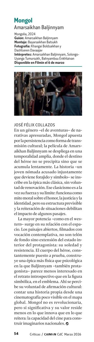 En un género –el de aventuras– de narrativas apresuradas Mongol apuesta por la persistencia como forma de transmisión cultural; la película de Amarsaikhan Baljinnyam se despliega en una temporalidad amplia, donde el destino del héroe no se precipita sino que se acumula lentamente. La historia –un joven nómada acusado injustamente que deviene forajido y símbolo– se inscribe en la épica más clásica, sin voluntad de renovación. Ese clasicismo es a la vez su fuerza y su límite: funciona como mito moral sobre el honor, la justicia y la identidad, pero su estructura previsible y la reiteración de situaciones debilitan el impacto de algunos pasajes.