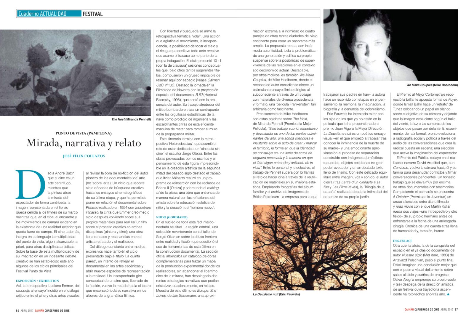 Decía André Bazin que el cine es un arte centrifugo mientras que la pintura atrae la mirada del espectador de forma centrípeta: la imagen representada en el lienzo queda ceñida a los límites de su marco mientras que en el cine, el encuadre y los movimientos de cámara evidencian la existencia de una realidad exterior que queda fuera de campo. El cine, además, integra en su lenguaje la multiplicidad del punto de vista, algo inalcanzable, a priori, para otras disciplinas artísticas. Sobre la base de esta multiplicidad y su integración en un incesante debate creativo se han establecido algunos de los ciclos principales del Festival Punto de Vista.