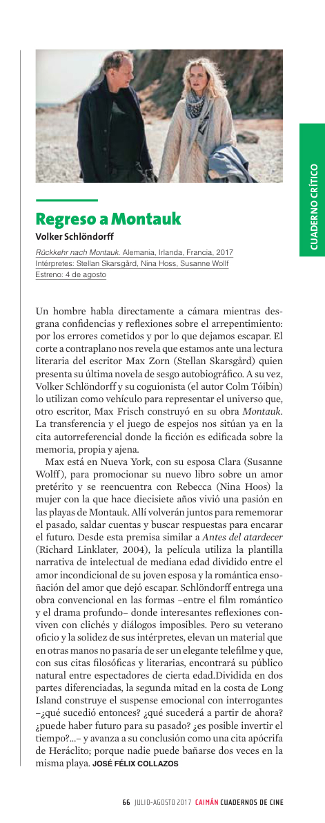 Max está en Nueva York, con su esposa Clara (Susanne Wolff), para promocionar su nuevo libro sobre un amor pretérito y se reencuentra con Rebecca (Nina Hoos) la mujer con la que hace 17 años vivió una pasión en las playas de Montauk. Allí volverán juntos para rememorar el pasado, saldar cuentas y buscar respuestas para encarar el futuro. Desde esta premisa similar a Before Sunset (Richard Linklater, 2004), la película utiliza la plantilla narrativa de intelectual de mediana edad dividido entre el amor incondicional de su joven esposa y la romántica ensoñación del amor que dejó escapar. Schlöndorff entrega una obra convencional en las formas –entre el film romántico y el drama profundo– donde interesantes reflexiones conviven con clichés y diálogos imposibles. Pero su veterano oficio y la solidez de sus interpretes, elevan un material que en otras manos no pasaría de ser un elegante telefilme y que, con sus citas filosóficas y literarias, encontrará su público natural entre espectadores de cierta edad.