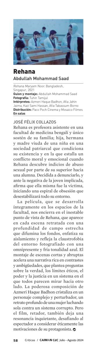 La película, que se desarrolla íntegramente en los espacios de la facultad, nos encierra en el inestable punto de vista de Rehana, que aparece en cada escena retratada con una profundidad de campo estrecha que difumina los fondos, enfatiza su aislamiento y refleja la claustrofobia del entorno fotografiado con una omnipresente y fría tonalidad azul. El montaje de escenas cortas y abruptas acelera una narrativa rica en contrastes y ambigüedades, que plantea preguntas sobre la verdad, los límites éticos, el poder y la justicia en un sistema en el que todos parecen mirar hacia otro lado. La poderosa composición de Azmeri Haque Badhon cristaliza en un personaje complejo y perturbador, un retrato profundo de una mujer luchando sola contra un sistema corrupto. Pero el film, retador, también deja una resonancia inquietante, desafiando al espectador a considerar éticamente las motivaciones y decisiones de su protagonista.