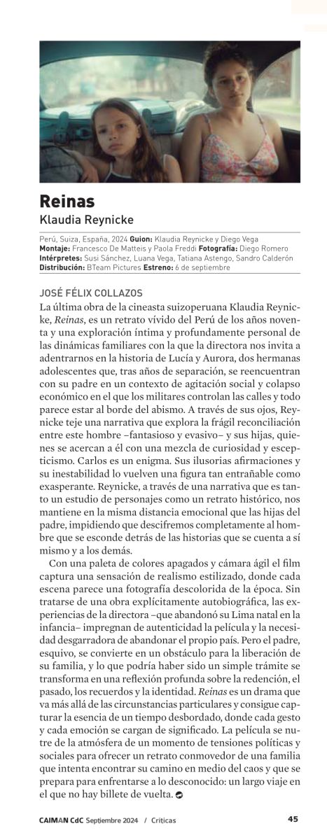 Con una paleta de colores apagados y cámara ágil el film captura una sensación de realismo estilizado, donde cada escena parece una fotografía descolorida de la época. Sin tratarse de una obra explícitamente autobiográfica, las experiencias de la directora –que abandonó su Lima natal en la infancia– impregnan de autenticidad la película y la necesidad desgarradora de abandonar el propio país. Pero el padre, esquivo, se convierte en un obstáculo para la liberación de su familia, y lo que podría haber sido un simple trámite se transforma en una reflexión profunda sobre la redención, el pasado, los recuerdos y la identidad. Reinas es un drama que va más allá de las circunstancias particulares y consigue capturar la esencia de un tiempo desbordado, donde cada gesto y cada emoción se cargan de significado. La película se nutre de la atmósfera de un momento de tensiones políticas y sociales para ofrecer un retrato conmovedor de una familia que intenta encontrar su camino en medio del caos y que se prepara para enfrentarse a lo desconocido: un largo viaje en el que no hay billete de vuelta.
