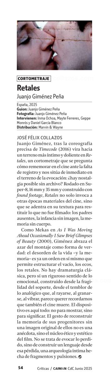Juanjo Giménez, tras la coreografía precisa de Timecode (2016) vira hacia un terreno más íntimo y doliente en Retales, un cortometraje que se pregunta cómo rememorar en el cine ante la falta de registro y nos sitúa de inmediato en el terreno de la evocación: ¿hay nostalgia posible sin archivo? Rodado en Super-8, 16 mm y 35 mm y construido con “found footage”, Retales no solo invoca a otras épocas materiales del cine, sino que se adentra en su textura para restituir lo que no fue filmado: los padres ausentes, la infancia sin imagen, la memoria sin cuerpo.