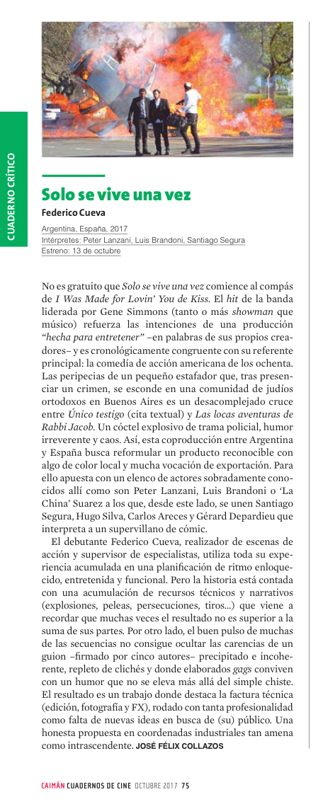 No es gratuito que Sólo se vive una vez comience al compás de I Was Made for Lovin’ You de Kiss. El hit de la banda liderada por Gene Simmons (tanto o más showman que músico) refuerza las intenciones de una producción “hecha para entretener” –en palabras de sus propios creadores– y es cronológicamente congruente con su referente principal: la comedía de acción americana de los años 80. Las peripecias de un pequeño estafador que, tras presenciar un crimen, se esconde en una comunidad de judíos ortodoxos en Buenos Aires es un desacomplejado cruce entre Único testigo (cita textual) y Las locas aventuras de Rabbi Jacob. Un cóctel explosivo de trama policial, humor irreverente y caos. Así, esta coproducción entre Argentina y España busca reformular un producto reconocible con algo de color local y mucha vocación de exportación. Para ello apuesta con un elenco de actores sobradamente conocidos allí como son Peter Lanzani, Luis Brandoni o “La China” Suarez a los que, desde este lado, se unen Santiago Segura, Hugo Silva, Carlos Areces y Gérard Depardieu que interpreta a un supervillano de comic.