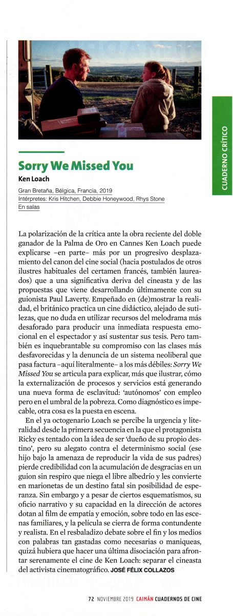 En el ya octogenario Loach se percibe la urgencia y literalidad desde la primera secuencia en la que el protagonista Ricky es tentado con la idea de ser “dueño de su propio destino”, pero su alegato contra el determinismo social (ese hijo bajo la amenaza de reproducir la vida de sus padres) pierde credibilidad con la acumulación de desgracias en un guion sin respiro que niega el libre albedrío y les convierte en marionetas de un destino fatal sin posibilidad de esperanza. Sin embargo y a pesar de ciertos esquematismos, su oficio narrativo y capacidad en la dirección de actores dotan al film de empatía y emoción, sobre todo en las escenas familiares, y la película se cierra de forma contundente y realista. En el resbaladizo debate sobre el fin y los medios con palabras tan gastadas como necesario o maniqueo, quizá hubiera que hacer una última disociación para afrontar serenamente el cine de Ken Loach: separar el cineasta del activista cinematográfico.