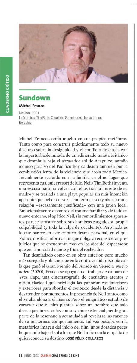 Michel Franco confía mucho en sus propias metáforas. Tanto como para construir prácticamente todo su nuevo discurso sobre la desigualdad y el conflicto de clases con la imperturbable mirada de un adinerado turista británico que deambula bajo el abrasador sol de Acapulco; antaño icónico paraíso del Pacífico hoy caldeado también por la combustión lenta de la violencia que asola todo México. Inicialmente recluido con su familia en el no lugar que representa cualquier resort de lujo, Neil (Tim Roth) inventa una excusa para no volver con ellos tras la muerte de su madre y se traslada a una playa popular sin más intención aparente que beber cerveza, comer marisco y abordar una relación –escasamente justificada– con una joven local. Emocionalmente distante del trauma familiar y de todo su nuevo entorno, el apático Neil, sin remordimientos aparentes, parece arrastrar sobre sus hombros cargados su propia culpabilidad (y toda la culpa de occidente). Pero nada es lo que parece en este críptico drama personal, en el que Franco dosifica información que obliga a reconsiderar prejuicios que se encuentran más en los ojos del espectador que en la mirada distante y fría del realizador.