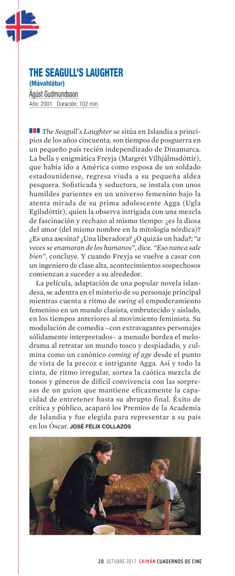 The Seagull´s Laughter (Mávahlátur, 2001) se sitúa en Islandia a principios de los 50; son tiempos de posguerra en un pequeño país recién independizado de Dinamarca. La bella y enigmática Freya (Margrét Vilhjálmsdóttir), que había ido a América como esposa de un soldado estadounidense, regresa viuda a su pequeña aldea pesquera. Sofisticada y seductora, se instala con unos humildes parientes en un universo femenino bajo la atenta mirada de su prima adolescente Agga (Ugla Egilsdottir) quien la observa intrigada con una mezcla de fascinación y rechazo al mismo tiempo: ¿es la diosa del amor (del mismo nombre en la mitología nórdica)? ¿es una asesina? ¿una liberadora? ¿o quizás un hada?; “a veces se enamoran de los humanos", dice. "Eso nunca sale bien”, concluye. Y cuando Freya se vuelve a casar con un ingeniero de clase alta, acontecimientos sospechosos comienzan a suceder a su alrededor.