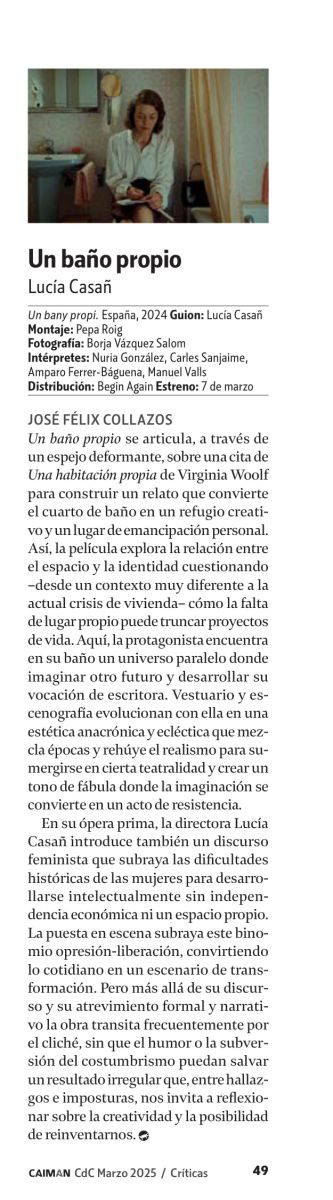 El debut de Lucía Casañ Rodríguez se articula, a través de un espejo deformante, sobre una cita de Una habitación propia de Virginia Woolf para construir un relato que convierte el cuarto de baño en un refugio creativo y un lugar de emancipación personal. De esta manera, la película explora la relación entre el espacio y la identidad cuestionando –desde un contexto muy diferente a la actual crisis de vivienda– cómo la falta de lugar propio puede truncar proyectos de vida. Aquí, la protagonista encuentra en su baño un universo paralelo donde imaginar otro futuro y desarrollar su vocación de escritora. Vestuario y escenografía evolucionan con ella en una estética anacrónica y ecléctica que mezcla épocas y rehúye el realismo para sumergirse en cierta teatralidad y crear un tono de fábula donde la imaginación se convierte en un acto de resistencia.