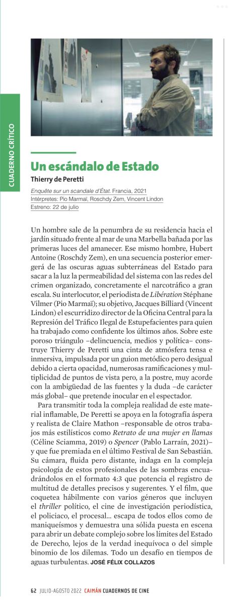 Un hombre sale de la penumbra de su residencia hacia el jardín situado frente al mar de una Marbella bañada por las primeras luces del amanecer. Ese mismo hombre, Hubert Antoine (Roschdy Zem), en una secuencia posterior emergerá de las oscuras aguas subterráneas del Estado para sacar a la luz la permeabilidad del sistema con las redes del crimen organizado, concretamente el narcotráfico a gran escala. Su interlocutor, el periodista de Libération Stéphane Vilmer (Pio Marmaï); su objetivo, Jacques Billiard (Vincent Lindon) el escurridizo director de la Oficina Central para la Represión del Tráfico Ilegal de Estupefacientes para quien ha trabajado como confidente los últimos años. Sobre este poroso triángulo –delincuencia, medios y política– construye Thierry de Peretti (Les Apaches, 2013) una cinta de atmósfera tensa e inmersiva, impulsada por un guion metódico pero desigual debido a cierta opacidad, múltiples ramificaciones y multiplicidad de puntos de vista pero, a la postre, muy acorde con la ambigüedad de las fuentes y la duda –de carácter más global– que pretende inocular en el espectador.