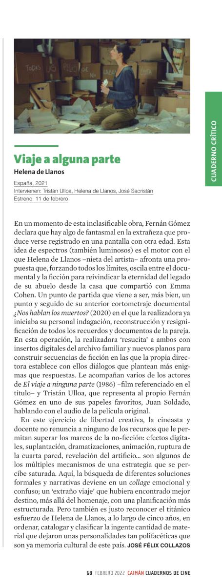 En un momento de esta inclasificable obra, Fernán Gómez declara que hay algo de fantasmal en la extrañeza que produce verse registrado en una pantalla con otra edad. Esta idea de espectros (también luminosos) es el motor con el que Helena de Llanos –nieta del artista– afronta una propuesta que, forzando todos los límites, oscila entre el documental y la ficción para reivindicar la eternidad del legado de su abuelo desde la casa que compartió con Emma Cohen. Un punto de partida que viene a ser, más bien, un punto y seguido de su anterior cortometraje documental ¿Nos hablan los muertos? (2020) en el que la realizadora ya iniciaba su personal indagación, reconstrucción y resignificación de todos los recuerdos y documentos de la pareja. En esta operación, la realizadora “resucita” a ambos con insertos digitales del archivo familiar y nuevos planos para construir secuencias de ficción en las que la propia directora establece con ellos diálogos que plantean más enigmas que respuestas. A ella le acompañan varios de los actores de El viaje a ninguna parte (1986) –film referenciado en el título– y Tristán Ulloa, que representa al propio Fernán Gómez en uno de sus papeles favoritos, Juan Soldado, hablando con el audio de la película original.