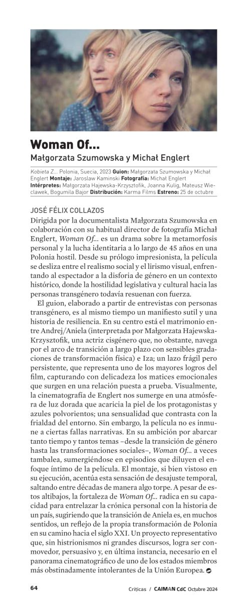 Dirigida por la documentalista Małgorzata Szumowska en colaboración con su habitual director de fotografía Michał Englert, Woman Of... es un drama sobre la metamorfosis personal y la lucha identitaria a lo largo de 45 años en una Polonia hostil. Desde su prólogo impresionista, la película se desliza entre el realismo social y el lirismo visual, enfrentando al espectador a la disforia de género en un contexto histórico, donde la hostilidad legislativa y cultural hacia las personas transgénero todavía resuenan con fuerza.